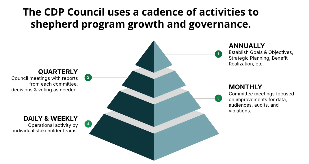 The full CDP Council, including members from the data, audience, audit, and CDP value committees, should meet annually to establish goals & objectives, strategic planning, and realize the benefits.